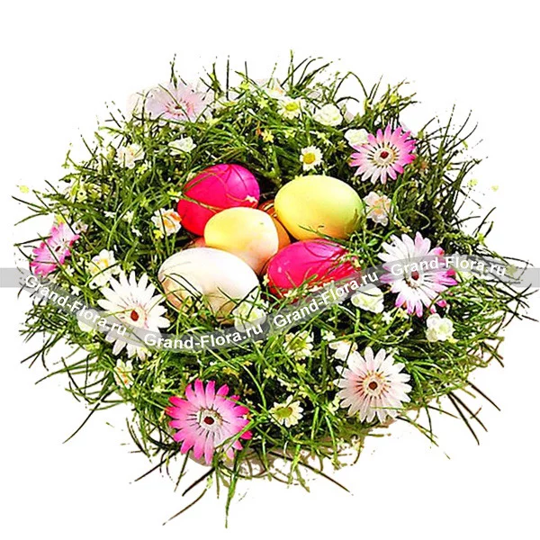 Букет из гербер, зелени, хризантем и яиц – отличное дизайнерское решение. Замечательное сочетание всех компонентов подчеркивает его тематику. Пасхальная композиция, выполненная в форме птичьего гнезда, будет отлично смотреться на праздничном столе. Оригинальность и изысканность ее не оставит никого равнодушным и обеспечит замечательное настроение Вам и Вашим близким.
