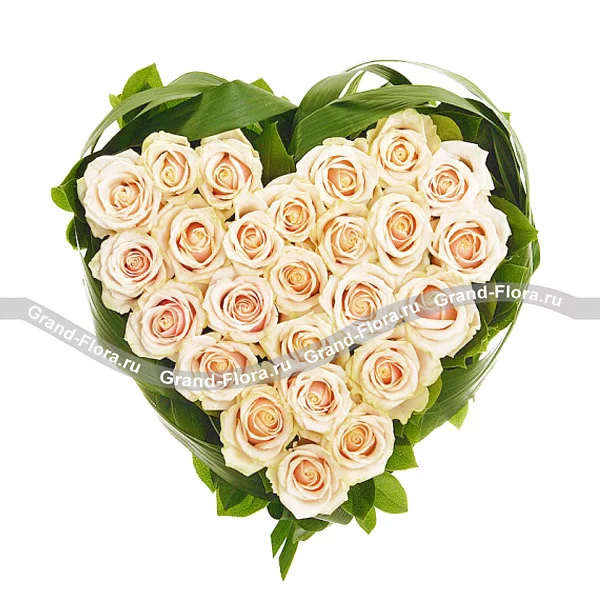 Прекрасная композиция из нежно-кремовых роз  несет в себе символ чистоты и невинности. Заказав своей любимой очаровательное, нежное сердце из роз с доставкой, собравшееся под зеленым ободком сочно-зеленой листвы, вы сможете, не говоря ни слова,  рассказать о том, насколько ваша избранница прекрасна и нежна. Ведь букет роз «Романтика» словно шепчет: "Я восхищаюсь твоей неземной и первозданной красотой! Ты  также совершенна, как и это сердце с розами". А наша международная служба доставки цветов сможет только ускорить ваше признание.