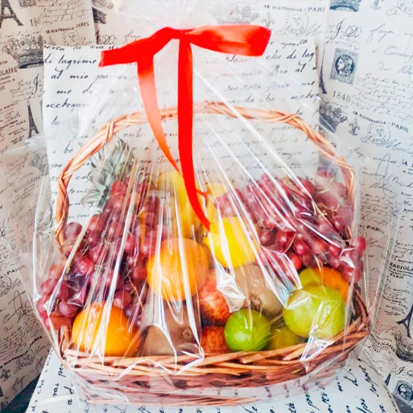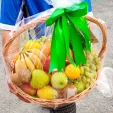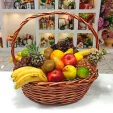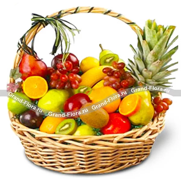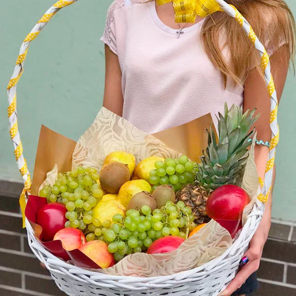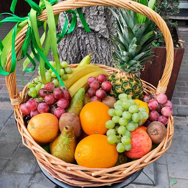 Плетеная корзина, доверху наполненная всяческими фруктами, будет чудесным подарком для ваших родных и близких, знакомых и друзей. Только представьте, там, где живут ваши родные сейчас мороз минус двадцать, и валит снег,  а международная служба доставки преподносит им корзину из фруктов, самых свежих, спелых и невероятно аппетитных. В большой корзине из фруктов есть все: ароматные яблоки и груши, сочные апельсины, спелые сливы и розовый виноград. Киви, бананы и ананас придают корзине фруктов экзотику жаркой Африки. Ручка корзины кокетливо перевязана зелеными веревочками. Корзина из фруктов с доставкой наградит ваших близких отменным здоровьем и отличным настроением.