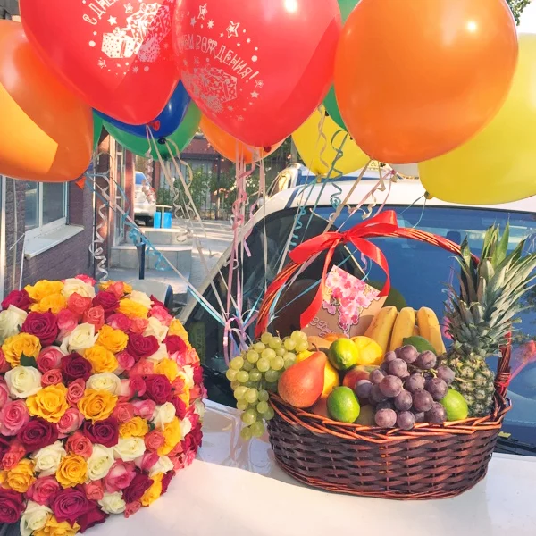 Доставили весь подарок во время. Очень красивый букет и большая корзина вкусных фруктов. Спасибо большое. Женщины мои в восторге!