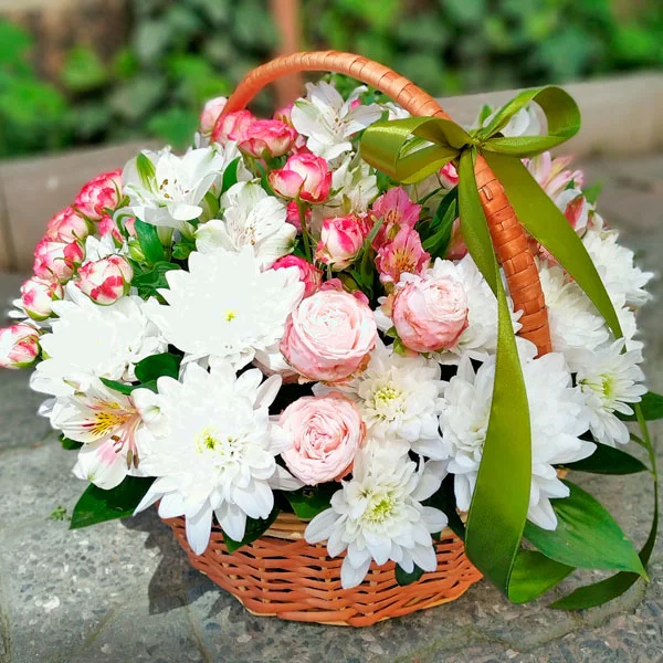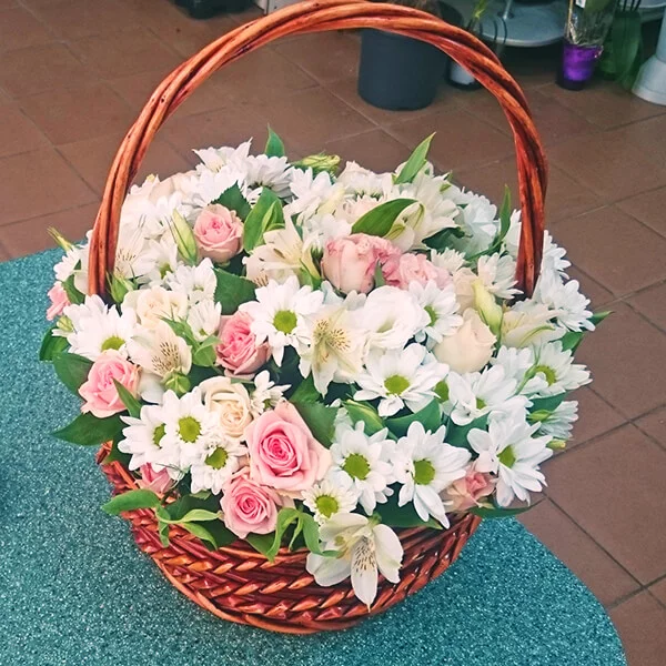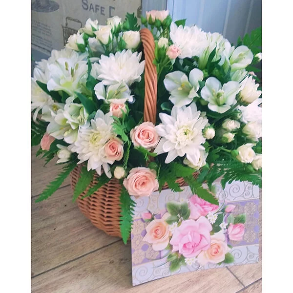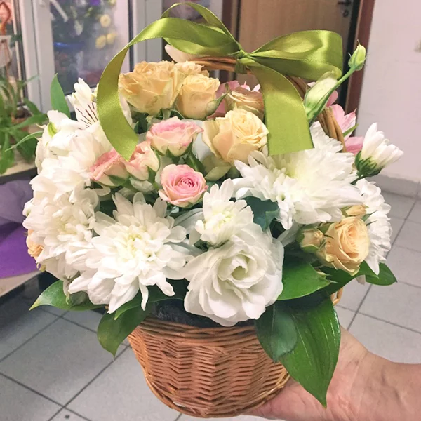(на фото): хризантема кустовая белая - 2 шт., роза кустовая белая - 2 шт., роза кустовая розовая - 3 шт., эустома белая - 1 шт., альстромерия белая - 3 шт., декоративная зелень, оазис, корзина средняя.