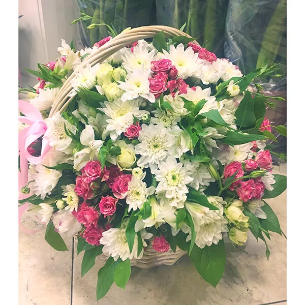 хризантема кустовая белая - 5 шт., роза кустовая белая - 4 шт., роза кустовая розовая - 5 шт., эустома белая - 3 шт., альстромерия белая - 5 шт., декоративная зелень, оазис, корзина средняя.
