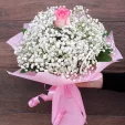 Букет выполнен из воздушной белой гипсофилы и розовой розы сорта Аква, обернутый в фетр в тон розе. Размер букета от 20см в диаметре, до 30 см в диаметре, в зависимости от выбранного Вами варианта букета. Обращаем Ваше внимание, что состав и оформление букета могут отличаться.