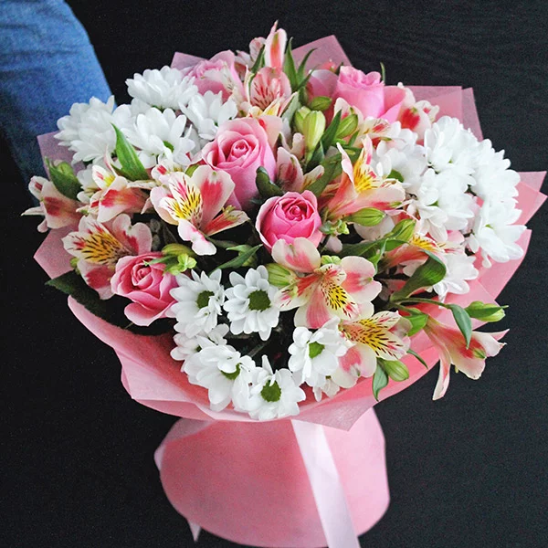 Светлый букет, собранный из ромашковых кустовых хризантем, розовых альстромерий и роз, наверняка пленит получателя своей наивной простотой, но в то же время и очаровательной красотой. Деликатное сочетание цветов, подчеркнутое оберткой из фетра и декоративным бантом, станет великолепным выбором для вручения маме или бабушке в памятный день.