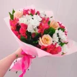Стандартный (на фото): роза розовая - 5 шт., хризантема кустовая ромашковая белая - 3 шт., альстромерия розовая - 5 шт., фетр розовый, бант розовый.