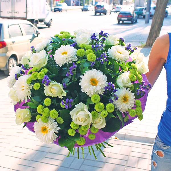 роза белая - 15 шт, гербера белая - 9 шт, хризантема кустовая зеленая - 10 шт, статица - 7 шт, салал, фетр из двух слоев - зеленый и фиолетовый, лента. Примерный размер: 45Х45 см.