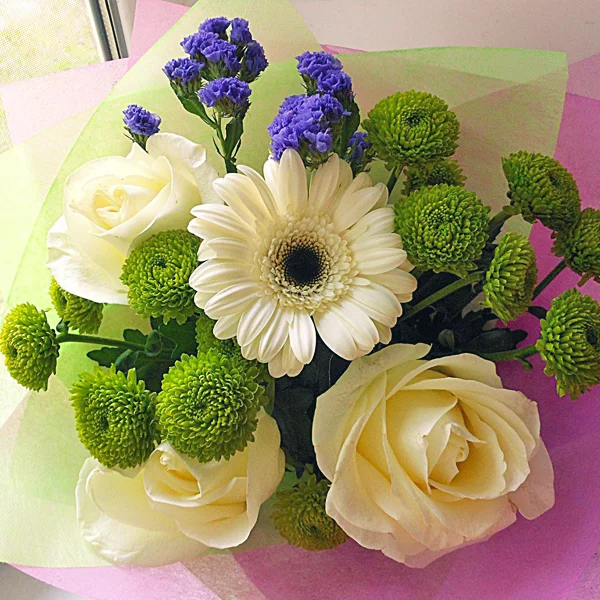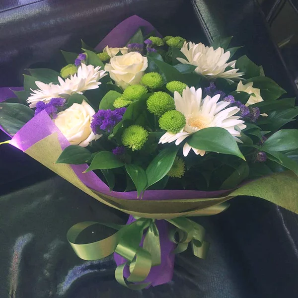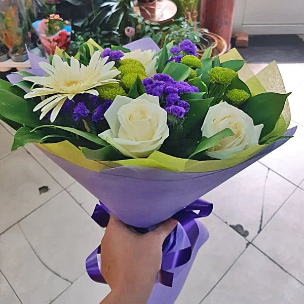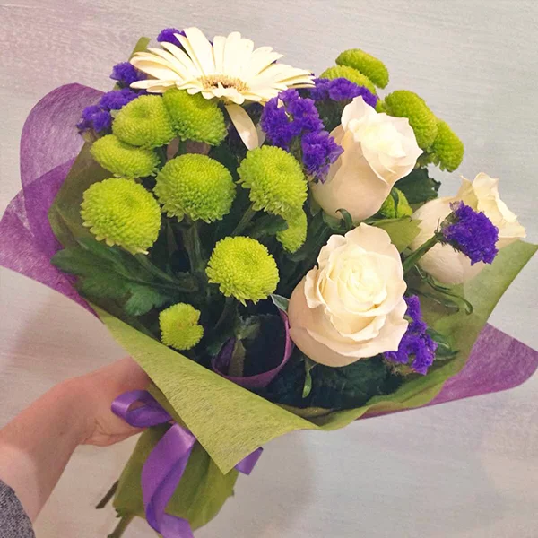 (на фото) роза белая - 5 шт, гербера белая - 3 шт, хризантема кустовая зеленая - 3 шт, статица - 2 шт,салал, фетр из двух слоев - зеленый и фиолетовый, лента. Примерный размер: 25Х25 см.