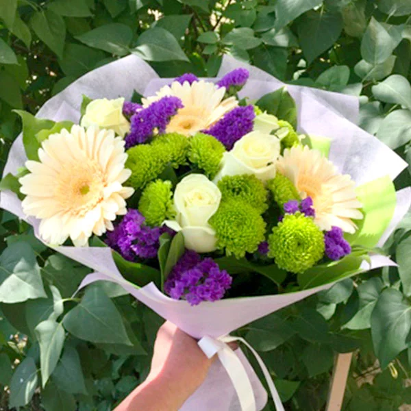 Нежную композицию, составленную из светлых роз и гербер, превосходно подчеркивает кустовая зеленая хризантема. Особое очарование и выразительность придает статица. Яркий фиолетовый букет великолепно подойдет для того, чтобы поздравить коллегу с дня рождения или любым другим торжеством.