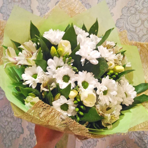 Уменьшенный: хризантема кустовая ромашковая - 3 шт, фрезия/альстромерия белая - 1 шт, альстромерия белая - 3 шт, салал, фетр зеленый, натуральная упаковка.