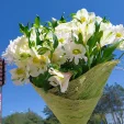 Уменьшенный: хризантема кустовая ромашковая - 3 шт, фрезия белая - 1 шт, альстромерия белая - 3 шт, салал, фетр зеленый, натуральная упаковка.