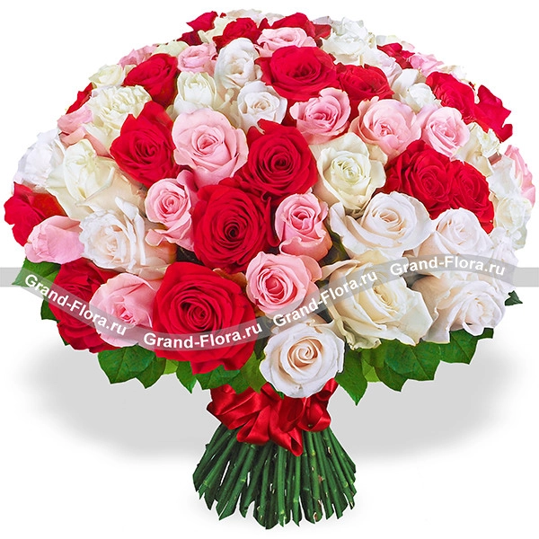 101 роза: роза ассорти (Эквадор) - 101 шт. (70 см), лента.