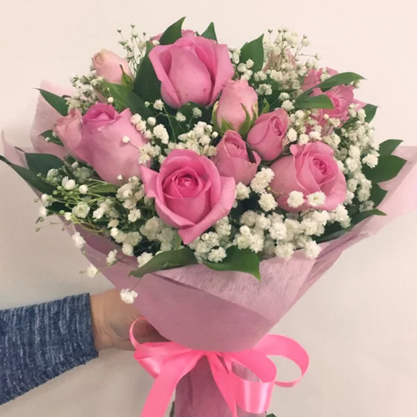 ЛЮКС: роза розовая - 9 шт., роза кустовая розовая - 5 шт., гипсофила - 4 шт., рускус, фетр розовый, бант розовый. Примерный диаметр букета 40х40 см.