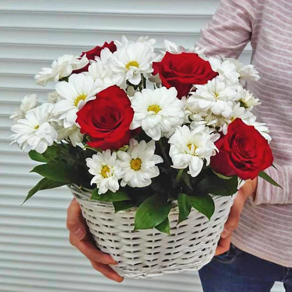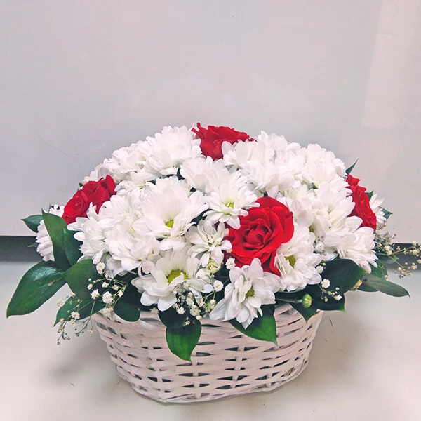 Великолепное сочетание эффектных красных роз и наивных белых хризантем, помещенное в плетеную белоснежную корзину, умело дополнено рускусом и гипсофилой.