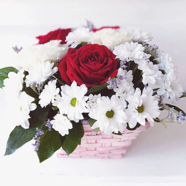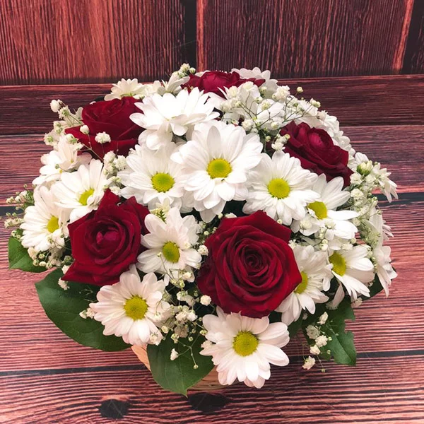 Стандартный (на фото): роза красная - 5 шт., хризантема кустовая ромашковая (белая) - 6 шт., гипсофила - 2 шт., рускус, оазис, корзина без ручки.