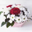 Уменьшенный: роза красная - 1 шт., хризантема кустовая ромашковая (белая) - 4 шт., гипсофила - 1 шт., рускус, оазис, корзина без ручки.