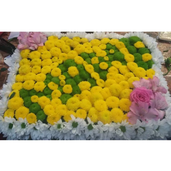 Уменьшенный: хризантема кустовая желтая (сантини) - 12 шт., хризантема кустовая зеленая - 6 шт., оазис.