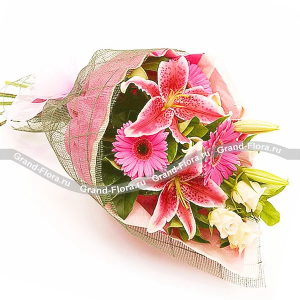 Стандартный: лилия розовая - 1 шт, герберы розовые - 3 шт, роза белая - 3 шт, декоративная зелень, сетка, креп розовый.