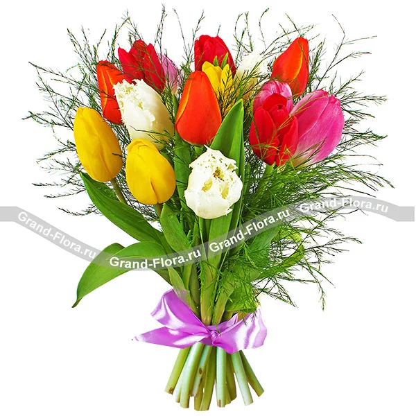 15 тюльпанов: тюльпаны (разноцветные)- 15 шт., декоративная зелень, сиреневый бант.