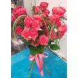 ЛЮКС: роза кустовая розовая - 15 шт, декоративная зелень, упаковка, лента розовая. Примерный размер: 35Х35 см.