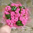 Уменьшенный: роза кустовая розовая - 5 шт, декоративная зелень, упаковка, лента розовая. Примерный размер: 20Х20 см.