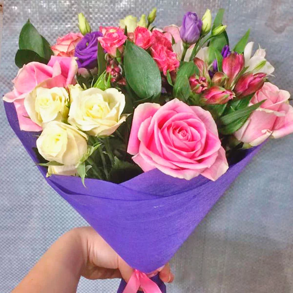 роза розовая - 11 шт, роза кустовая розовая - 2 шт, роза кустовая белая - 2 шт, фрезия(альстромерия) фиолетовая - 3 шт, фрезия(альстромерия) белая - 2 шт, эустома белая - 4 шт, декоративная зелень, фетр фиолетовый. Примерный размер: 45Х45 см.