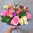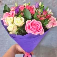 роза розовая - 7 шт, роза кустовая розовая - 2 шт, роза кустовая белая - 1 шт, фрезия(альстромерия) фиолетовая - 2 шт, фрезия(альстромерия) белая - 2 шт, эустома белая - 3 шт, декоративная зелень, фетр фиолетовый. Примерный размер: 35Х35 см. Букет представлен на фото
