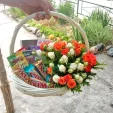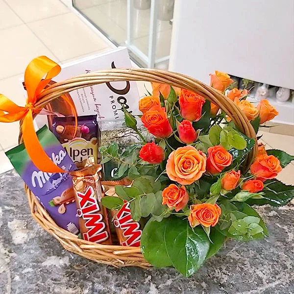 Стандартный: роза кустовая (микс) 20 см - 5 шт., конфеты "DOVE Promises" - 1 шт., шоколад "Milka" - 1 шт., Twix - 3 шт., чай "Greenfield" - 1 шт., печенье "Alpen Gold" - 1 шт., декоративная зелень, оазис, корзина средняя.
