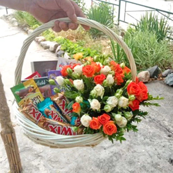 Уменьшенный: роза кустовая (микс) 20 см - 3 шт., конфеты "DOVE Promises" - 1 шт., шоколад "Milka" - 1 шт., Twix - 1 шт., чай "Greenfield" - 1 шт., печенье "Alpen Gold" - 1 шт., декоративная зелень, оазис, корзина средняя.