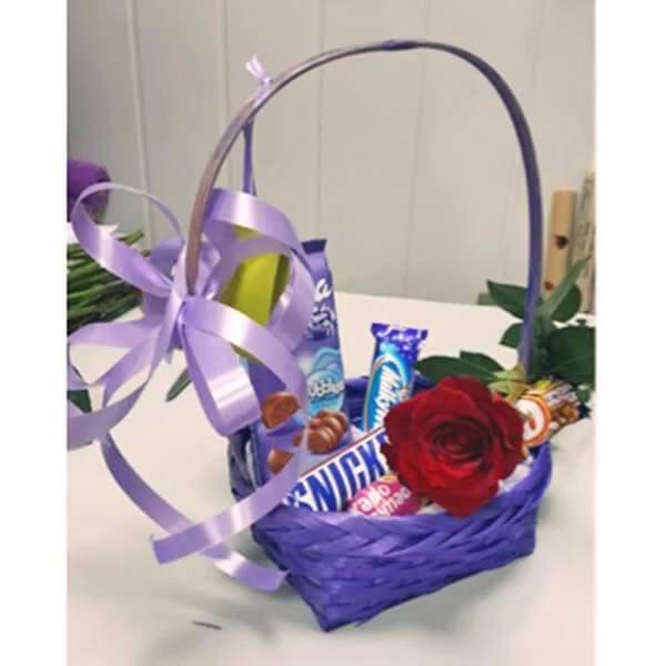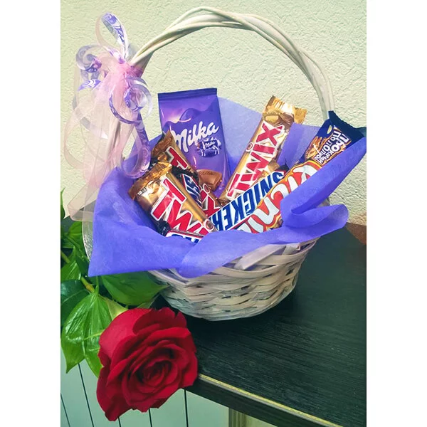 ЛЮКС: роза красная (70 см) - 1 шт., Twix - 4 шт., Snikers (маленький) - 4 шт., Picnic - 2 шт., шоколад "Milka" - 2 шт., декоративная зелень, корзина малая, фетр фиолетовый, бант сиреневый.