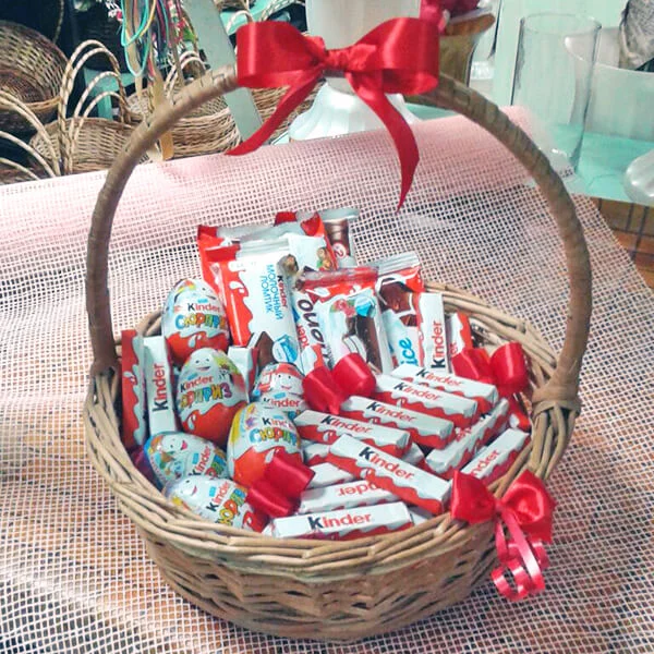 Стандартный: Kinder Сюрприз (яйцо) - 6 шт., Kinder Bueno - 4 шт., Kinder chocolate (шоколад молочный в упаковке) - 8 шт., Kinder chocolate со злаками - 4 шт., kinder schoko bons - (125г) 1 уп., корзина средняя, лента красная, бант красный.