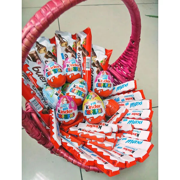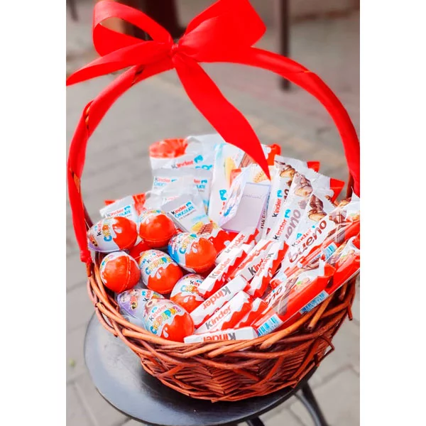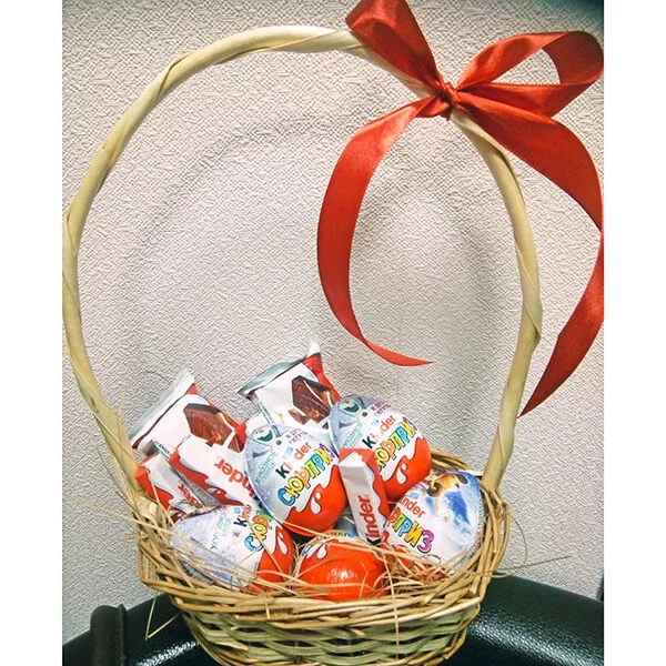 Стандартный: Kinder Сюрприз (яйцо) - 6 шт., Kinder Bueno - 4 шт., Kinder chocolate (шоколад молочный в упаковке) - 8 шт., Kinder chocolate со злаками - 4 шт., kinder schoko bons - (125г) 1 уп., корзина средняя, лента красная, бант красный.