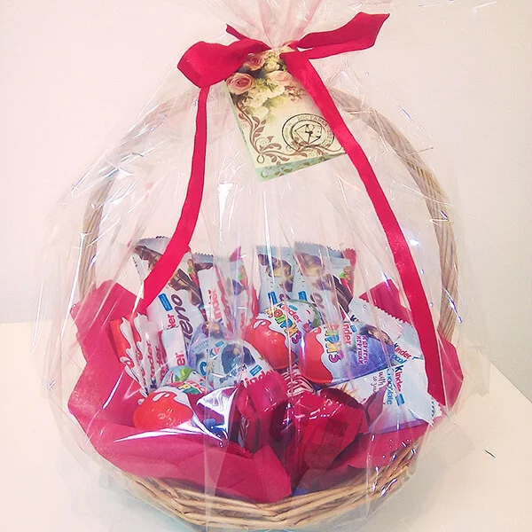 Уменьшенный: Kinder Сюрприз (яйцо) - 5 шт., Kinder Bueno - 3 шт., Kinder chocolate (шоколад молочный в упаковке) - 8 шт., Kinder chocolate со злаками - 3 шт., kinder schoko bons - (125г) 1 уп., корзина малая, лента красная, бант красный.