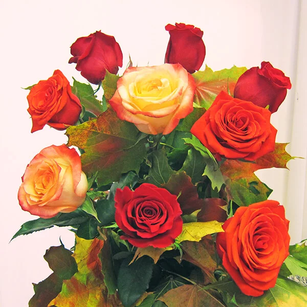 11 роз: роза красная - 4 шт., роза оранжевая - 4 шт., роза кремовая - 3 шт., Декор - осенние листья.