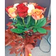 Выигрышное сочетание роз трех оттенков – нежного кремового, страстного красного и пленительного оранжевого – поможет выразить чувство благодарности и уважения. Дополненный осенними листьями букет не оставит равнодушной его получательницу