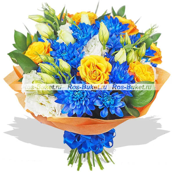ДЕЛЮКС: роза кустовая желтая - 6 шт, эустома белая - 8 шт, хризантема кустовая синяя - 7 шт, рускус, оранжевый фетр, бант синий.