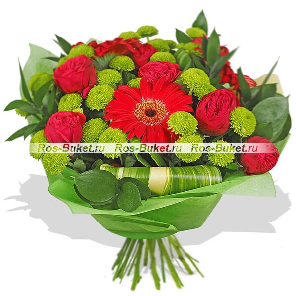 Стандартный (на фото): роза красная - 6 шт, гербера красная - 3 шт, хризантема кустовая зеленая - 4 шт, лист аспидистры загнутый - 2 шт (в центр), рускус, фетр зеленый.