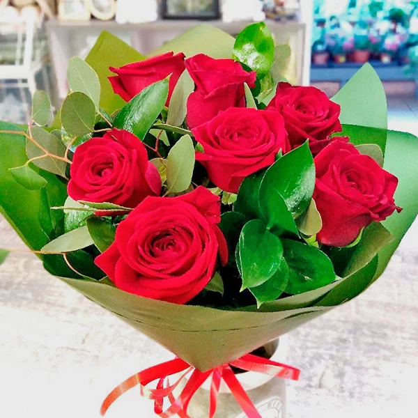 7 роз: роза красная - 7 шт., рускус - 3 шт., эвкалипт - 2 шт., упаковка, бант красный.