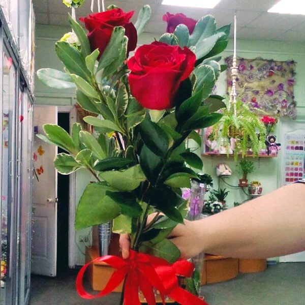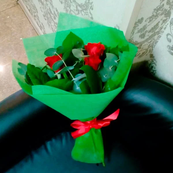 3 розы: роза красная - 3 шт., рускус - 2 шт., эвкалипт - 1 шт., упаковка, бант красный.