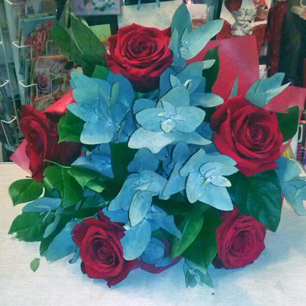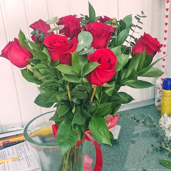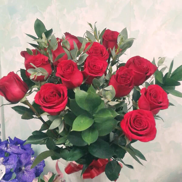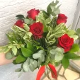 Букет из красных роз, гармонично дополненный рускусом и эвкалиптом, станет отличным поздравлением как для женщин, так и для мужчин.