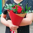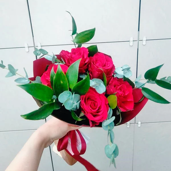 5 роз: роза красная - 5 шт., рускус - 3 шт., эвкалипт - 2 шт., упаковка, бант красный.