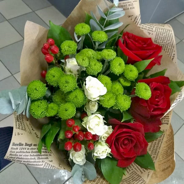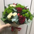 Люкс: роза красная - 5 шт., роза кустовая белая - 3 шт., хризантема кустовая зелёная 5 шт., аспидистра - 3 шт., эвкалипт - 2 шт., салал 2 шт., гиперикум - 3 шт., упаковка крафт, лента. Примерный размер: 35Х35 см.