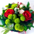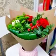 Уменьшенный: роза красная - 2 шт., роза кустовая белая - 1шт., хризантема кустовая зелёная - 1 шт., аспидистра - 1 шт., эвкалипт - 1 шт., салал - 2 шт., гиперикум - 1 шт., упаковка крафт, лента. Примерный размер: 20Х20 см.