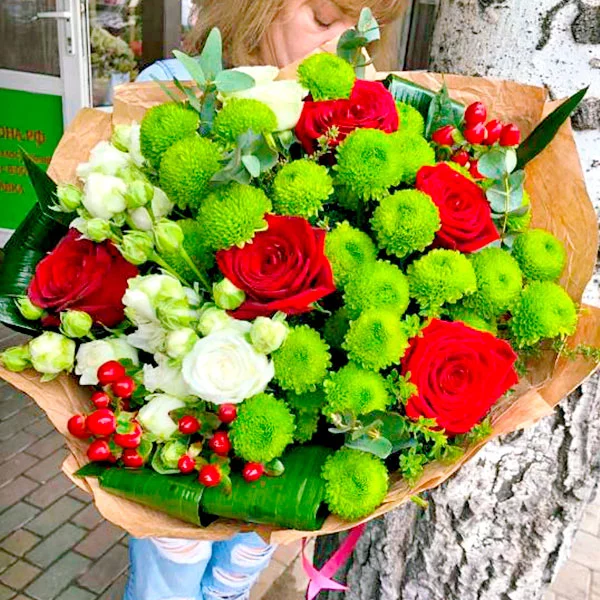 ДЕЛЮКС: роза красная - 9 шт., роза кустовая белая - 6 шт., хризантема кустовая зелёная 8 шт., аспидистра - 5 шт., эвкалипт - 4 шт., салал 4 шт., гиперикум - 5 шт., упаковка крафт, лента. Примерный размер: 45Х45см.