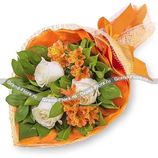 Белоснежные розы, утопающие в ярких альстромериях и зелени. Элегантно сдержанный и при этом невероятно притягательный букет станет отличным презентом для любого мероприятия!