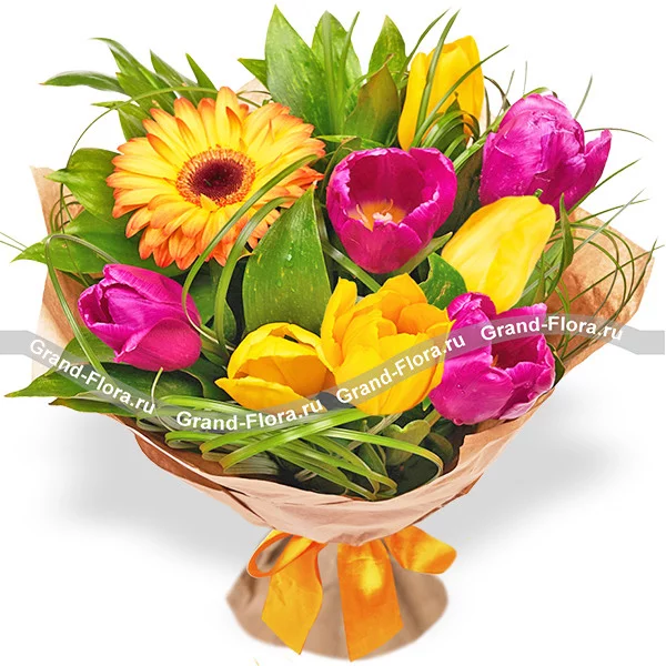 Солнечные краски - букет из гербер и тюльпанов