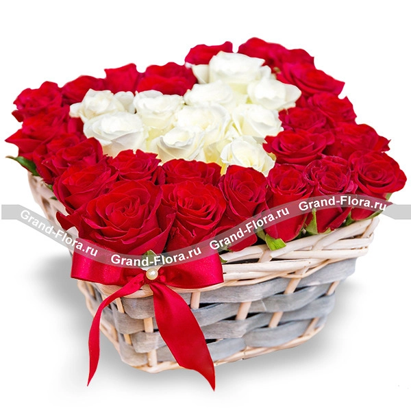 роза белая - 10шт., роза красня - 25шт., красная лента - 1шт., корзина.