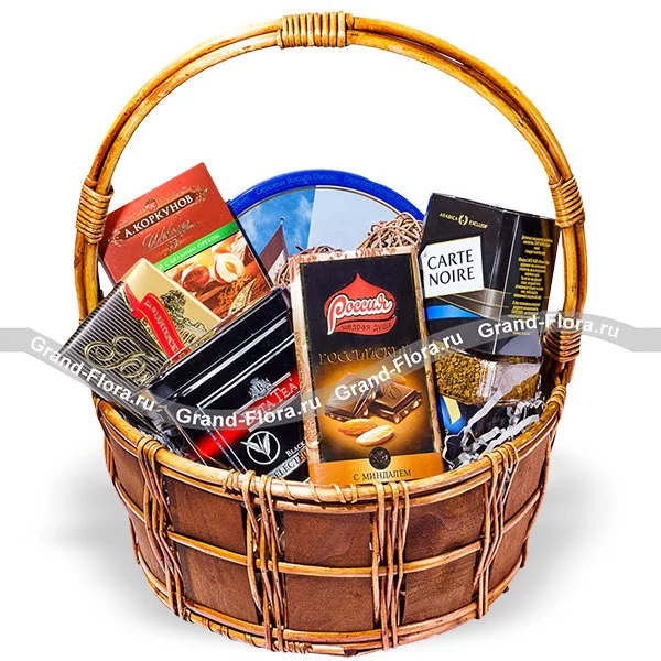 Стандартный: шоколад "Коркунов" - 1 шт., шоколад "Россия" - 1 шт., шоколад "Бабаевский" - 1 шт., кофе "Carte Noire" - 95 г., чай "Beta Tea" - 100 г., печенье в железной коробке, декор, корзина.