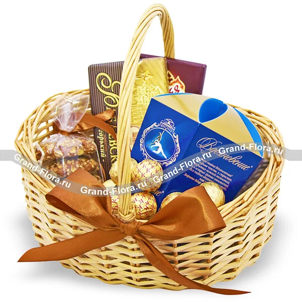 Стандартный: конфеты "Вдохновение" - 150г., шоколад "Россия" - 1 шт., шоколад "Бабаевский" - 1 шт., конфеты "Коркунов" - 135 гр., печенье, декор, корзина.