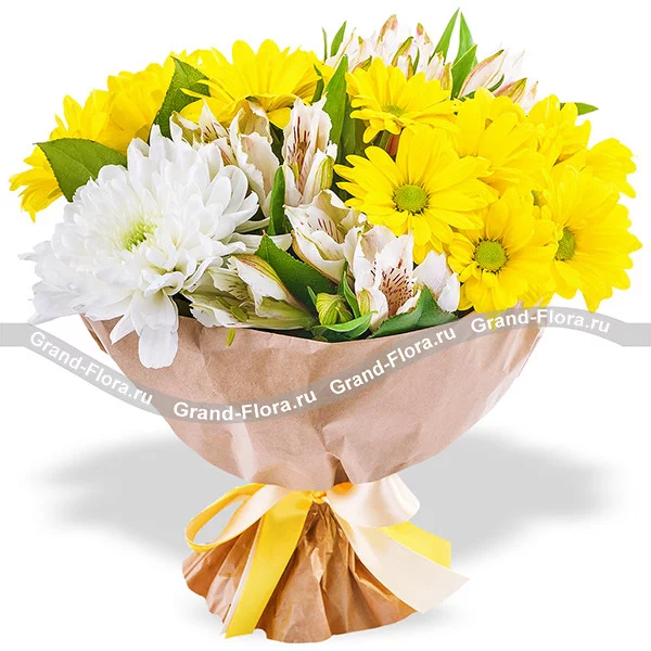 Стандартный: хризантема белая - 3 шт., альстромерия белая - 5 шт., хризантема кустовая желтая ромашковидная -5 шт., декоративная зелень, упаковка крафт, лента двойная бело-желтая. Примерный размер: 30Х30 см.