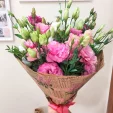 Стандартный: эустома розовая - 7 шт., эустома белая - 4 шт., декоративная зелень, упаковка крафт, лента розовая.